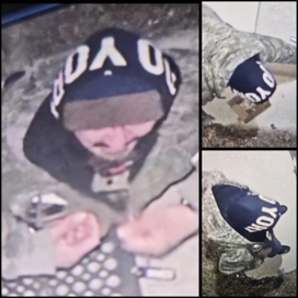 The suspect is described as wearing a light camouflage jacket over a black hooded sweater, with the words “ZOO YORK” visible on the hood.