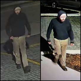 The suspect is described as male, White, approximately 6”, 30 – 45 years of age, medium build, with a short grey beard. He was wearing a black hoodie, a light brown winter hat, brown pants and brown work boots.
